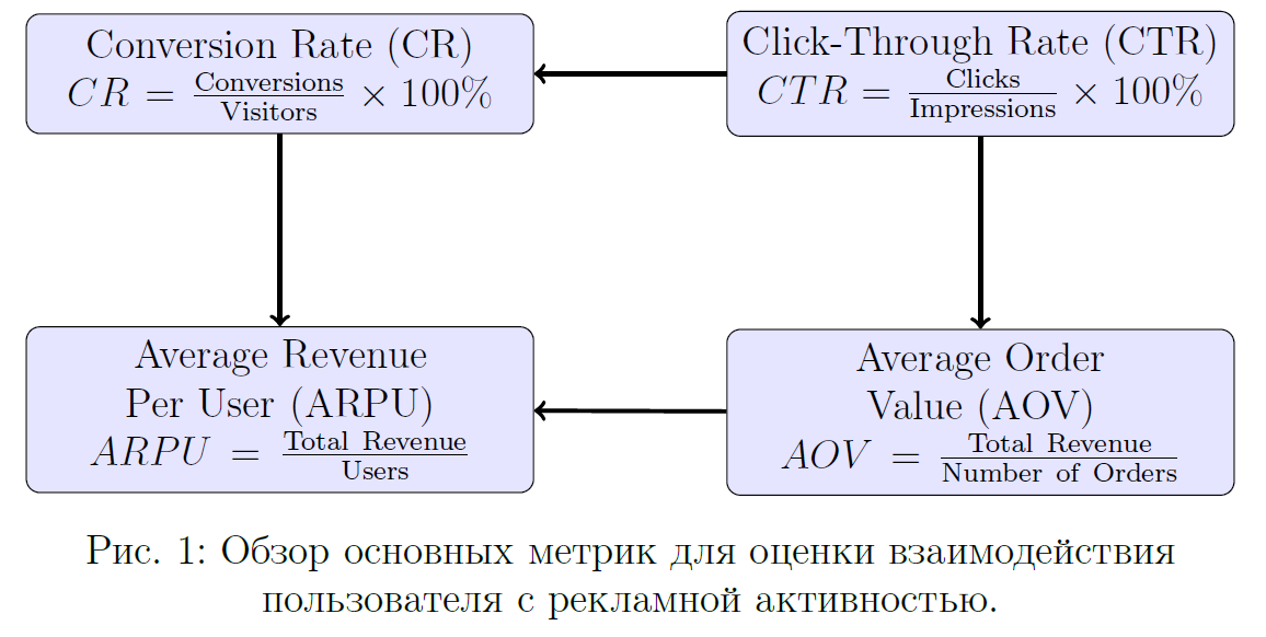 Следующая диаграмма иллюстрирует четыре основных метрики и их взаимосвязи в рамках оценки рекламной кампании.