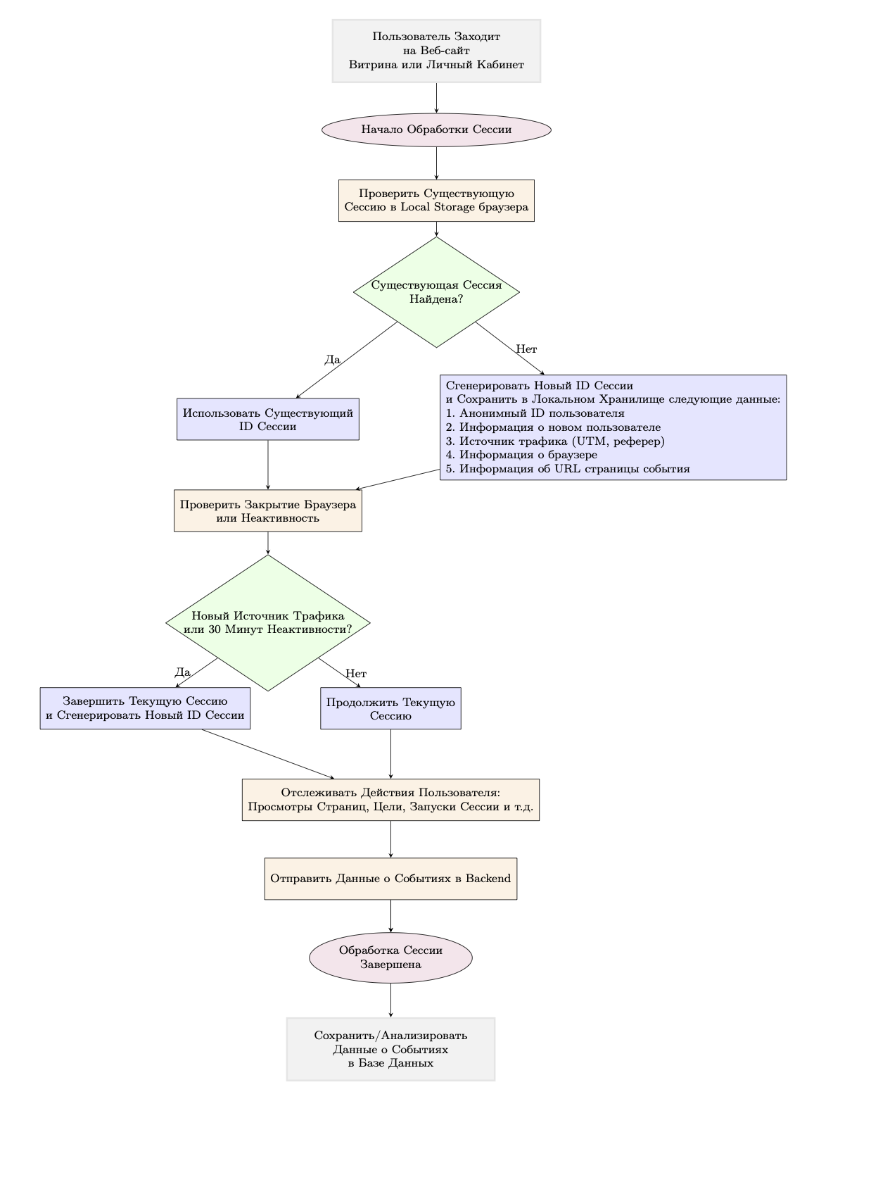 Аналитика со стороны сервера - любая вендорная аналитика на стороне клиента (браузера) дает неполные данные, поскольку отправка части данных блокируется адблокерами и политиками приватности. Серверные логи - это данные, хранящиеся внутри компании и не зависящие от сторонних сервисов. Однако для построения Сквозной Аналитики со стороны сервера необходимо реализовать трекинг источников трафика на клиенте (браузере) с помощью "обработчика сессий". Ноже приведен пример схемы такого решения: