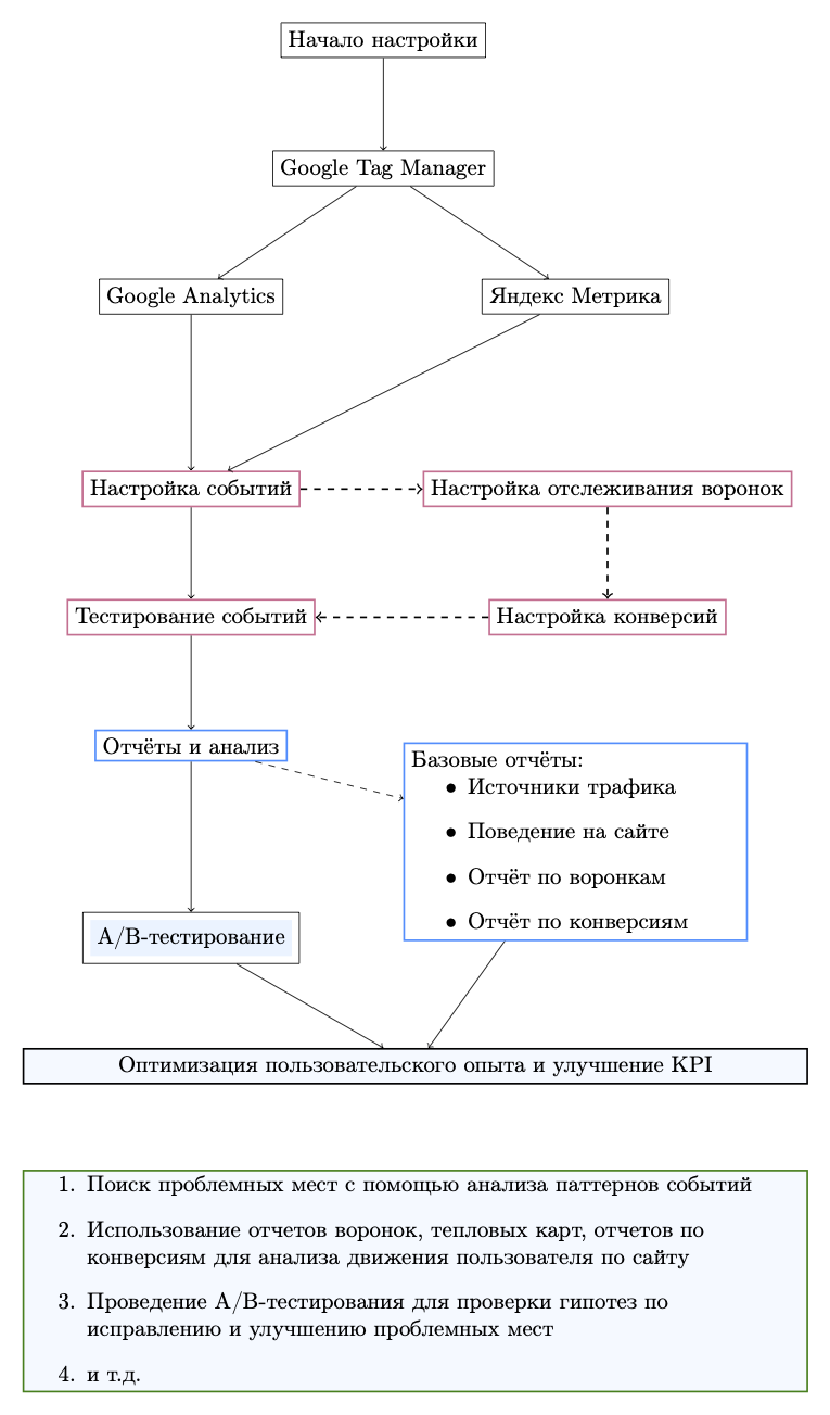 Этот текст представляет собой объяснение на одном из примеров схемы построения веб-аналитики для сайта. На самом деле, существует множество различных инструментов и решений, которые могут быть использованы в зависимости от задач конкретного проекта. Веб-аналитика может включать в себя использование, как различных платформ, так и быть реализована с помощью только одного инструмента, например, Яндекс.Метрика. Важно учитывать особенности каждого проекта и выбирать те инструменты, которые наилучшим образом подходят для достижения поставленных целей. Данная же статья рассматривает один из возможных вариантов и подходов, как пример для иллюстрации.