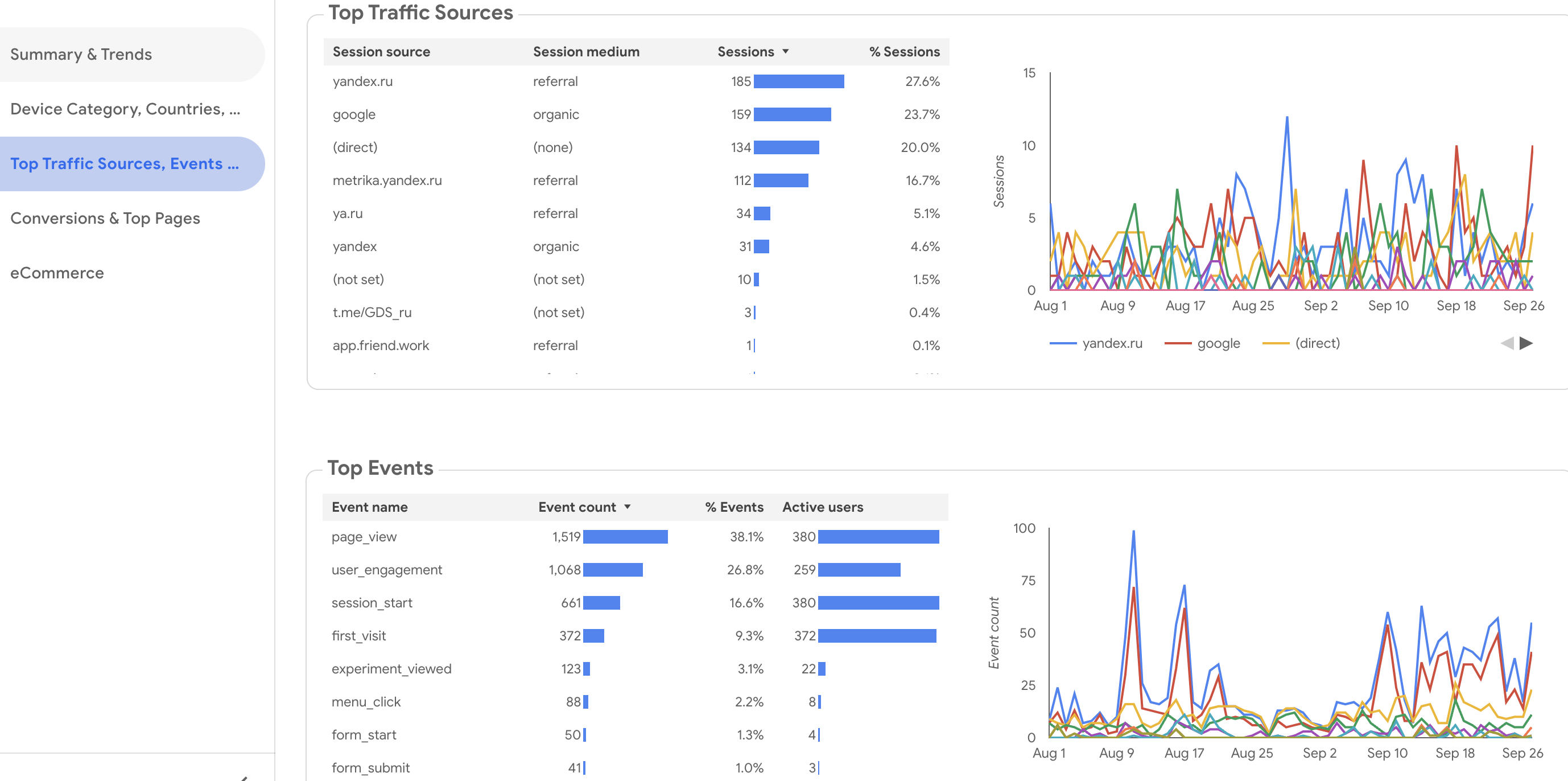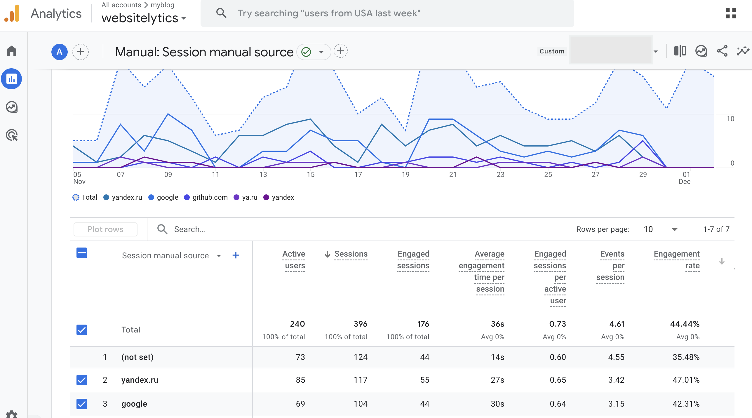 Пример отчёта по источникам трафика в Google Analytics для сайта websitelytics.top: