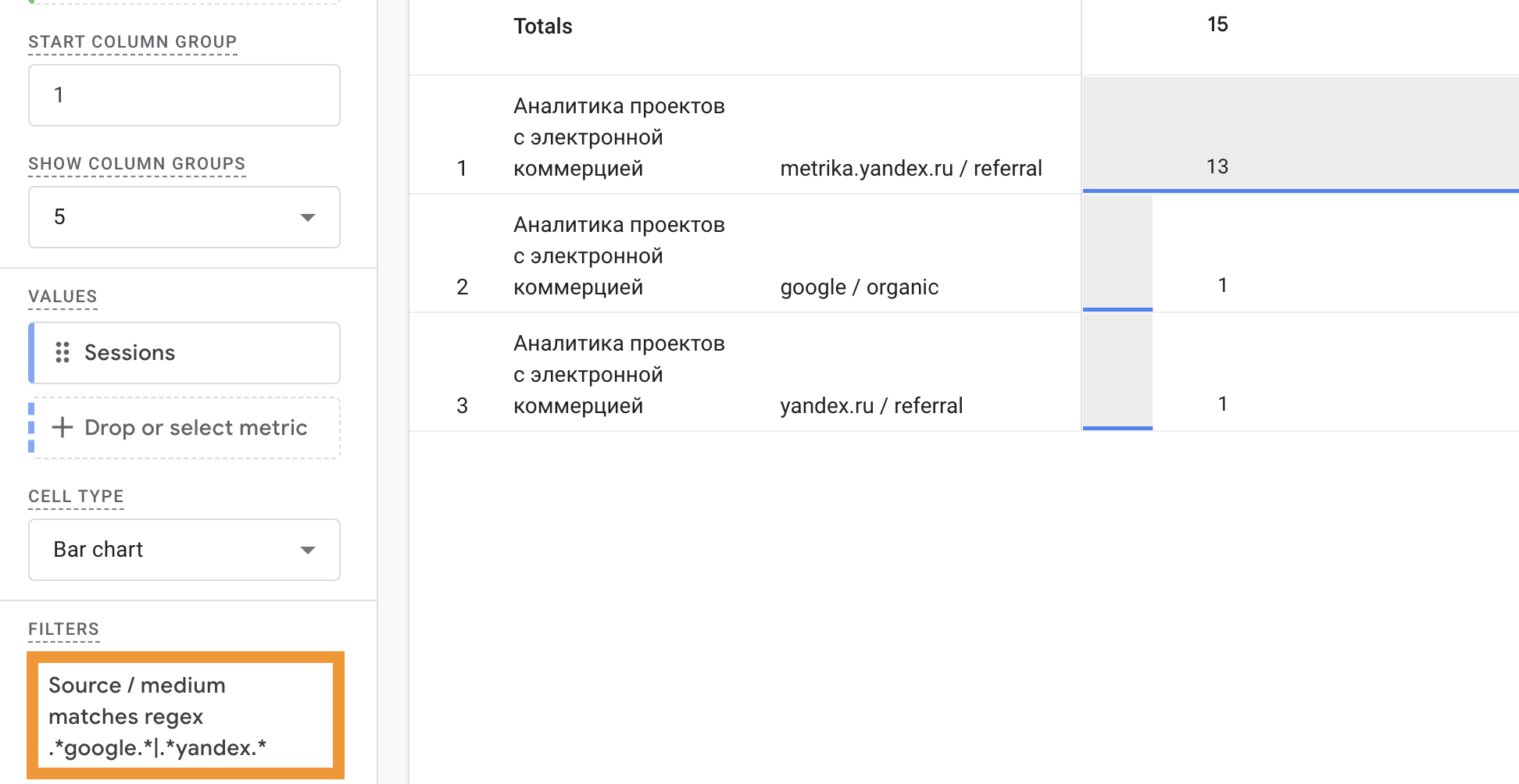 Пример построения отчета о наиболее популярных страницах сайта websitelytics.top с помощью Google Analytics и применением фильтров с ипользованием regex: